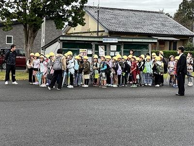 1~4年生は遠足です。雨の予報ですが、状況を見て雨天時の計画に切り替えるなどの対応をします。子どもたちは、貸し切りバスが停車しているのを見て、さらに遠足への期待が高まったようです。「みんなで楽しい遠足にしよう」「みんなの楽しい思い出をつくろう」と出発しました。