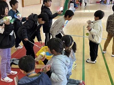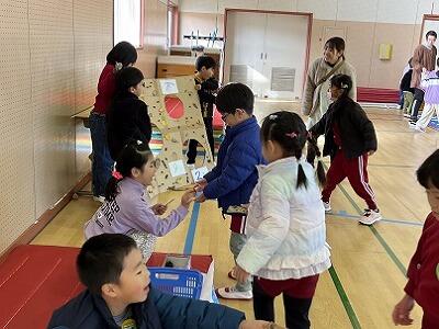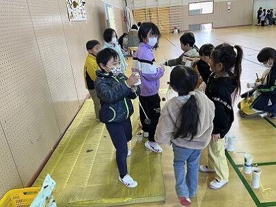 1年生が保育所・幼稚園の年長さんと交流活動をしました。どんぐりや松ぼっくりなどを使っておもちゃを作り、年長さんに楽しんでもらおうと、これまで交流会の準備と話合いをしてきた1年生です。声のかけ方や説明の仕方を考えながら、積極的に関わっていました。年長さんの様子をよく見て、拍手をしたり手伝ったりする1年生に、成長を感じました。