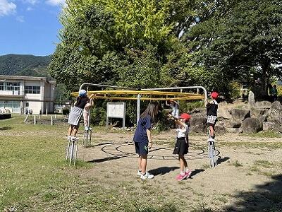 また、5年生がフラフープを使った表現に取り組む場面に遭遇しました。2人組でも3人組でも4人組でもできるように工夫して、創作していました。自分の考えをもつ子、自分を表現する子です。