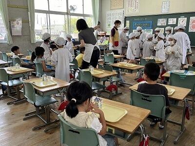 1年生が給食当番にチャレンジしています。これまで何をどのようにするのか、6年生の給食当番の動きを見ていました。こぼさず時間内に終わらせるなど、よく考えながら慎重にチャレンジしています。