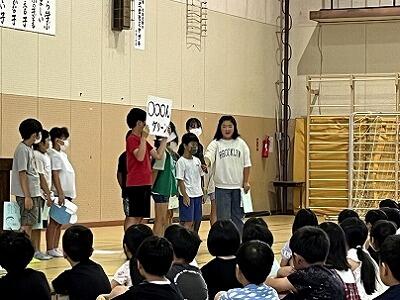 その後は児童集会です。保健委員会の子どもたちから、「『睡眠』と『水分』を十分にとって熱中症を予防しましょう」と呼びかけがありました。また、運営委員会からは、前回の代表委員会で決まった児童会目標「ごみ0で、いつもきれいな飯野小にしよう」が発表されました。子どもたちが、飯野小学校をよりよくするために、命を守るために、何が必要かを考えて話し合い、できること(呼びかけやポスター、ボランティア活動)に取り組んでいきます。