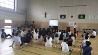 登校日にようこそ先輩を行いました。今年度は、日高裕貴先生及び小林秀峰高等学校新体操部の皆様をお招きして、模範演技の披露と講話をしていただきました。