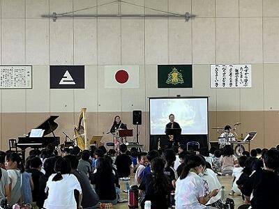 また、今日は音楽鑑賞教室が行われました。「リベラハープアンサンブル」の皆さんによる生演奏に包まれて、心地よい時間を過ごしました。サクソフォン、フルート、ハープ、パーカッション等の音色が会場いっぱいに広がり、心も満たされました。