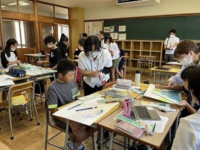 夏季休業を利用して、飯野小学校の子どもたちが、飯野高校の美術部と飯野中学校の美術指導者からご指導いただきながら、絵画制作を行いました。構想の段階から話をしながら進めていくため、子どもたちも絵のイメージが描きやすかったようです。参加した子どもたちから「花火の描き方を教えてもらって前より花火らしく描けました。」「白い絵の具で光を入れることを教えてもらって、川が流れているようになりました。」などの感想が聞かれました。