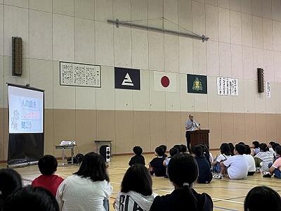全校朝会で、7月の目標について、担当者より話をしました。「人の話をしっかり聞こう」の「しっかり」とはどのような聞き方か、具体的に4つのことが話されました。今日から全員で取り組みます。