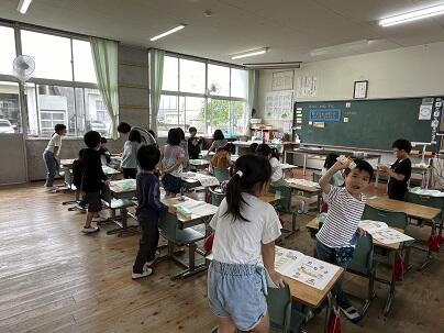 今日も朝から6年生と5年生が朝のボランティア活動で、草や落ち葉を掃いてくれました。午前中の学習を見て回ると、家庭科室で5年生が、協力しておいしいお茶の入れ方にチャレンジしていました。3年生は、社会科で学校周辺を歩いて調べていました。1年生の算数では、数字を見てブロックをならべたり、数の大小を考えたりしていました。図書室でも本の貸し出しが始まっていました。今日も子どもたちが考えたり教え合ったりする姿がたくさん見られました。