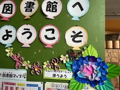 シルバーケアステーション「ほうよう」の皆様が、色紙で「あじさい」を作ってくださいました。図書支援の坂下月子先生が新たな地域と学校とのつながりとして取り組んでいただいています。早速、図書図書室に飾られていました。図書室に来た子どもたちを明るく迎えてくれます。子どもたちにとって通いたくなる図書室です。ありがとうございます。
