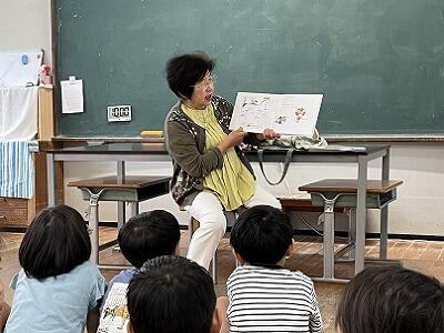 雨の月曜日。1年と6年の子どもたちに、ボランティア「ひよこ」の皆様による読み聞かせがありました。学年や季節に合わせて選んでくださった絵本の世界に、子どもたちはすぐに入り込んで楽しんでいました。
