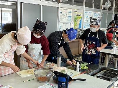 5年生が、家庭科の授業でエプロンを制作中です。11月15日、飯野高校の生徒さんからエプロンづくりを教えていただきました。分からないところや上手くできないところを、丁寧に優しく教えてもらえてとても嬉しかったようです。エプロンを使う度に、この時の嬉しい気持ちを思い出すことでしょう。