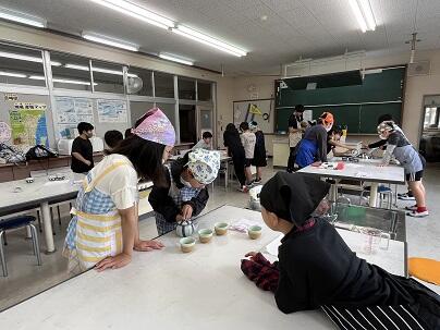 今日も朝から6年生と5年生が朝のボランティア活動で、草や落ち葉を掃いてくれました。午前中の学習を見て回ると、家庭科室で5年生が、協力しておいしいお茶の入れ方にチャレンジしていました。3年生は、社会科で学校周辺を歩いて調べていました。1年生の算数では、数字を見てブロックをならべたり、数の大小を考えたりしていました。図書室でも本の貸し出しが始まっていました。今日も子どもたちが考えたり教え合ったりする姿がたくさん見られました。