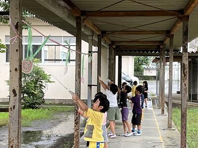 今日もいろいろな学習活動に取り組んでいます。1年生のシャボン玉や水鉄砲で的当て、5年生の手縫いにチャレンジ、6年生の創作活動などの場面を見ることができました。子どもたちが、集中して取り組んでいます。