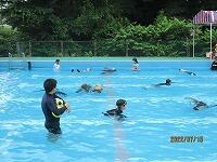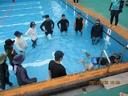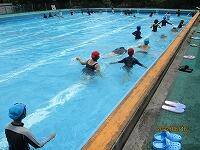 子どもたちは、靴を履いて、長袖長ズボンを着てプールに入りました。プールの中を歩いたり背浮きをしてみたりしましたが、普段の水泳学習の時よりも動きにいことや、プールサイドに上がることも難しいことを体感しました。