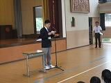 校長先生からは、式辞の中で「担任の先生が心を込めて呼ぶ名前に、大きな声でしっかりと返事をする様子、自分の夢を自信もって伝える姿に、皆さんの成長を感じ、頼もしい限りです。学校の様々な行事においては一人一人が責任を果たし、仲間を協力して成功させようとする意欲に感心しました。そして毎日の朝のボランティア活動を通して校内はもちろんのこと、学校周辺もきれいにしてくれました。これからもこの根気強さを大切に、思いやりのある中学生になってください。」と話がありました。