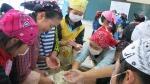 蒸しあがったもち米はとてもいい香りがしました。きねとうすを使った、昔ながらのもちつき。ペアを組み「よいしょ~、よいしょ~!」と息を合わせ力強くついていきました。幼稚園・保育園生との交流もあり、優しく声をかけてきねを一緒に持ったり、丸め方を教えてあげたりして、上手にお世話をすることができました。