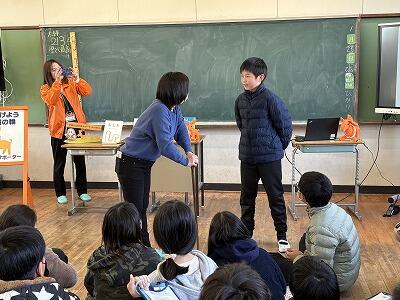 実際にどのように声かけをしたらよいか、2人の児童が代表で実践し、それを見た他の児童が積極的に意見を出し合い、さらに学びを深めることができていました。