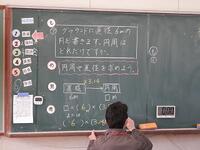 「円周50m、直径はいくらかな?」「う~ん?どうやって求めればいいかな。」「関係図をかいてみて…」授業が進んでいきます。
