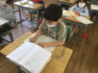 教室では、感染予防をしながら、家庭で子ども達が懸命に取り組んだ宿題のチェックをしたり、やり直しや新たな課題に取り組ませたりしました。また、図書室の本の返却・貸出しも行いました。読み聞かせやリズム遊びなどをしている学級もあり、楽しい時間を過ごすことができました。