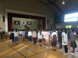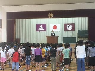 校長先生をはじめ生徒指導担当の先生、保健指導担当の先生方が、1学期の学校生活のようすや2学期にがんばってほしいことなどについてお話をされました。