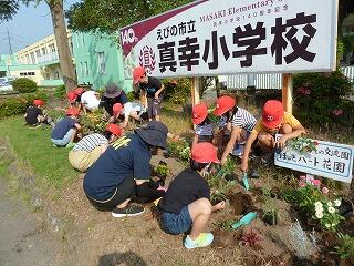 毎年、『真幸まちづくり協会』の方と活動している「花の苗植え」ですが、今年は新型コロナウイルス感染予防のため、2年生の子ども達だけで苗植えを行いました。ひとつひとつ心をこめて植えましたので、今年もきれな花を咲かせてくれることでしょう。
