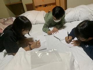 おいしい夕食をいただいた後、子ども達は入浴等を済ませ、部屋で1日の振り返りをしおりに書いたり、友達と楽しく過ごしたりしました。