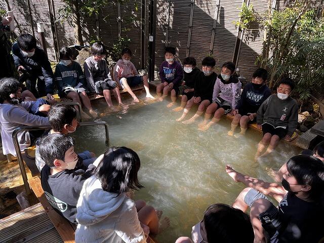 2月28日、3年生は、京町観光ホテルで、えびの市の温泉の歴史などについて学びました。この地域の観光が温泉などの産業とかかわりが深いことや温泉の効能などについて、「京町温泉旅館組合みなほ会」(温泉宿女将の会)の方が丁寧に教えてくださいました。足湯体験も行いました。子どもたちの中には、「足湯から上がったとき、足がすっきりした」と感想を述べている子もいました。