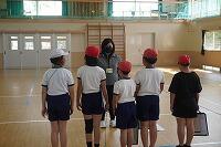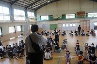 4月25日に、えびの警察署や交通安全協会の方に来ていただいて、交通教室を行いました。雨が降っていたので、体育館で雨天時の計画で実施しました。低学年は歩行指導、中・高学年は自転車の乗り方について指導していただきました。