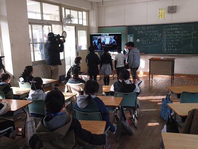 2月15日(水)2年生の子どもたちがハワイのラナキラ小学校と遠隔授業を行いました。お互いの学校について紹介した後、ハワイの文化について紹介がありました。ラナキラ小の子どもたちとじゃんけん、ジェスチャーゲームをして楽しく過ごしました。今回は、テレビの取材も入り、昼や夕方のテレビのニュースにも紹介されました。