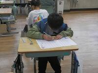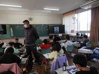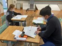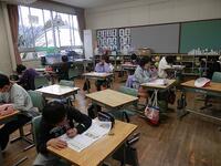 4年1組・2組の教室では、1年間の「漢字のまとめ」テストを行っていました。みんな一生懸命に問題に取り組んでいます。