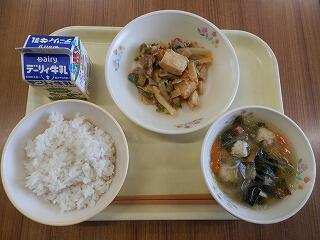 今日のメニューは、牛乳、麦ごはん、つくね団子スープ、ホイコーローでした。子どもたちは、もりもり食べていました。