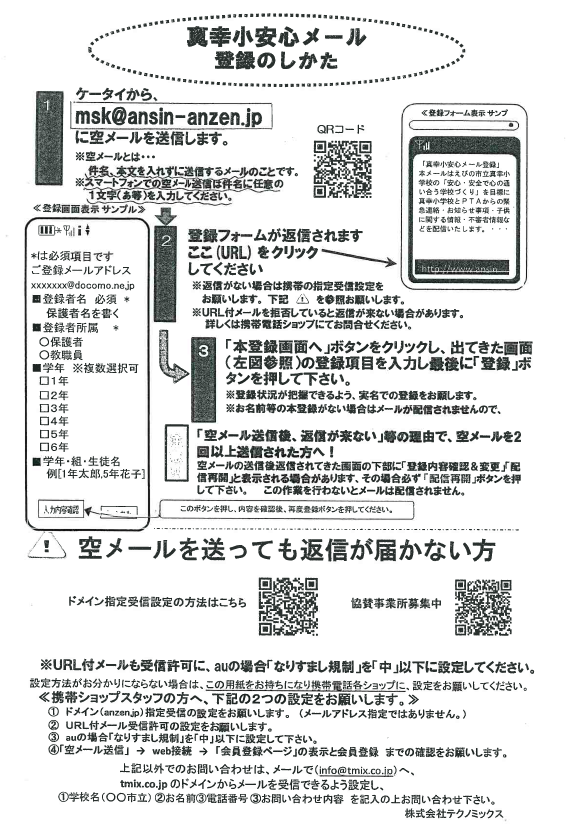 これまで児童が学校を欠席したり遅刻したりする場合には、用紙や電話による届け出方法をとっておりましたが、「用紙を持たせる児童が近所にいない」、「朝、学校に電話がなかなかつながらない」などの不便さがあったかと思います。そこで、この度、安心メールを使った欠席・遅刻の届け出方法ができるようになりましたのでお知らせいたします。