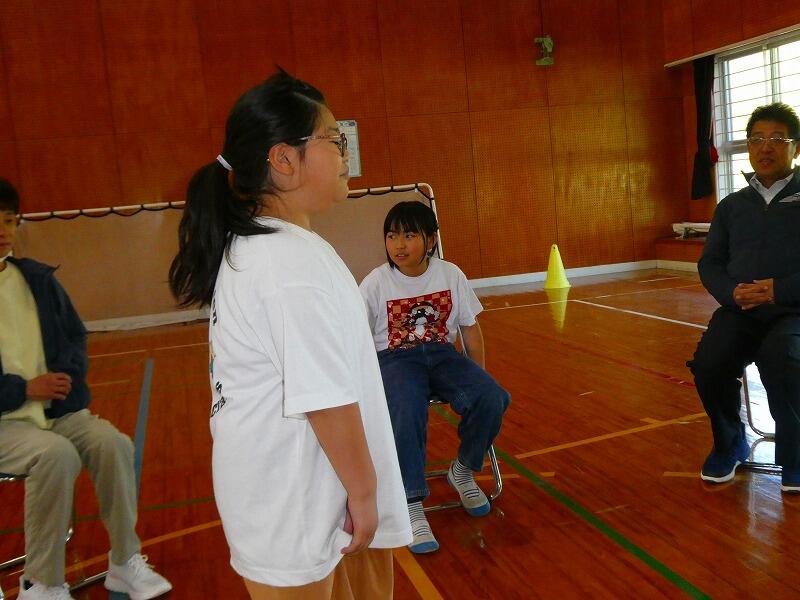えびの市の社会福祉協議会2名の講師を招いて、「アイマスク・車椅子体験」を全校児童で行いました。講師の方の分かりやすい説明と考えさせる質問によって「どんな声かけをしたらよいか」「どんなサポートをしたらよいか」など相手の立場になって考える体験ができました。