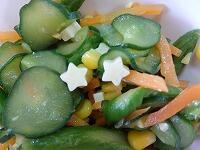 ハヤシライスには、豚肉、玉ねぎ、にんじん、しめじ、グリンピース、トマトなどが入っています。具だくさんで、大きめの豚肉やしめじもたくさん入っています。濃厚で甘めの味付けがとても美味しいです。チーズサラダには、チーズの他に、アスパラガス、きゅうり、とうもろこし、にんじんなどが入っています。星形のチーズが可愛らしいです。また、きゅうりやアスパラガスがシャキシャキです。彩りがよく酸味のある味が爽やかでとても美味しいです。