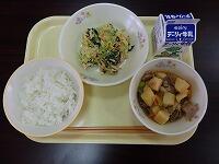 肉じゃがには、じゃがいも、いもこ豚、厚揚げ、玉ねぎ、にんじん、しいたけ、糸こんにゃく、青豆などが入っています。給食では、おなじみのいもこ豚は、厚みがあって食べ応えがあります。味付けが良く、食が進みます。和え物には、ツナ、キャベツ、きゅうり、にんじん、小松菜などが入っています。小松菜は、東京の小松川が特産地だったことからこの名がついた走です。野菜が細かく刻んであり、食べやすいです。アスパラガスやきゅうりの食感が美味しさを引き立てています。