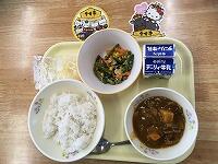 今日の給食は、えびの産宮崎牛カレーでした。と~ってもやわらかくて、おいしいかったです。宮崎牛ステッカーをいただきました。