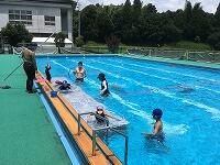 1年生もどきどきしながら、プールの中にあるプールフロアにのってプールに入っていました。