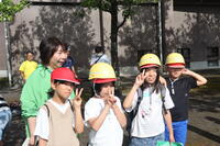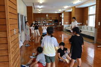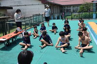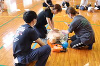 子どもたちは初めてダミー人形を使っての心臓マッサージを行いました。しっかりと胸を押すこと、AEDの使い方を学びました。