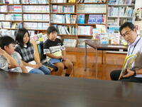 前の時間に撮った各自の音読の動画を見ながら、読む速さや付け足したせりふ、動きについての感想をお互いに述べ合いました。