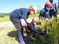 農家のおじちゃんと語る会の牛やイチゴを育てている方からお話を聞き、田んぼへ移動し稲刈りをしました。足踏み式脱穀機、唐箕も使いました。