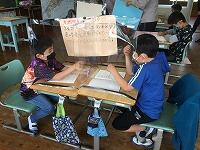 3・4年が良い姿勢で習字をしていました。先生の話をしっかり聞いて、肘をつけずに筆を動かしていました。