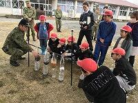 自衛隊の方々が来校され、防災教室が行われました。今回は、保護者や地域の方々も参加されました。2つのグループに分かれ、担架の作り方や応急手当、災害時の水の確保などについて教えていただきました。最後には、防災グッズを紹介していただき、車両を見学させていただきました。今日学んだことが、災害が起こった時の自助や共助となり、被害を最小限にできるといいですね。