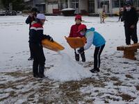 今朝は、雪が積もりました。岡元っこタイムは、学級の時間でした。1年生は、初めての雪だるま作りでした。みんなでかまくらも作りました。