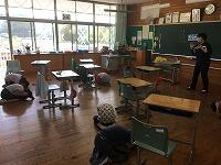 今日は、避難訓練(噴火)が行われました。外で遊んでいる時に硫黄山が噴火したことを想定して訓練しました。教室に避難した後は、友だちと距離をとりながら座り、担当の先生から「部屋の中に入る」「情報確認」「ドアや窓に近づかない」などのお話がありました。