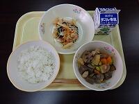 【献立】麦ご飯、鶏肉と野菜の炊き合わせ、千草和え