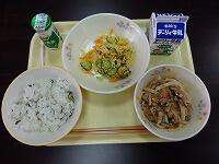 【献立】減量大根葉ご飯、じゃじゃ麺、春キャベツのサラダ、ジョア(マスカット)