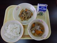 【献立】麦ご飯、おおびら汁、ごぼとん丼