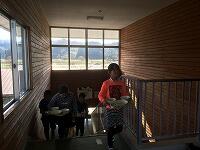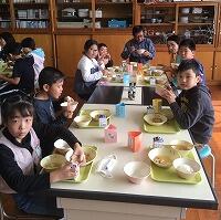 今日はふれあい給食の日でした。2つのグループに分かれ、ホールでは、産業文化祭のに出品された作品が展示されているので、友だちの作品を見ながら給食を食べていました。給食を持っての移動も上手になってきています。