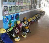 10時の訓練用アラームに合わせて、どの学級でも一斉に安全確保行動「1DROP!=まず低く!」、「2COVER!=頭を守り!」、「3HOLDON!=動かない!」ができたようです。訓練後は、非常時の避難について先生からお話がありました。