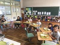 今日は、全校給食でした。全校給食の日は、話がはずんで食事の時間がかかっていましたが、時間内に給食を食べられるようになってきました。みんなで食べると、食事の時間が楽しく、より給食がおいしいようです。