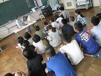 7月17日にお魚教室を開催しました。講師として、鹿児島大学水産学部の教授に来ていただきました。また、補助として学生の方も4名来てくださいました。はじめに、錦江湾の特徴や住んでいる魚などについて話をしてくださいました。特に、えびについて分かりやすく教えていただきました。講話の後は、グループに分かれてえびの観察を行いました。実際に、えびを手にとって自分の目で観察しながら、足の数、雄と雌の見分け方などについて調べていました。子どもたちは、海の生き物に大変興味をもったようです。