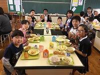 5月9日(木)は全校給食でした。岡元小学校では、毎月1回この全校児童と先生が一緒に給食を食べています。この日は、ALTの先生も入って、美味しく給食をいただきました。